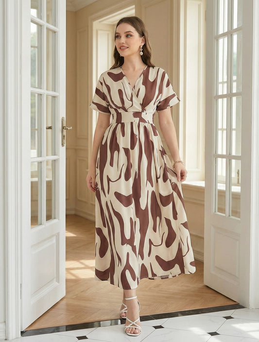 Brown & Beige Abstract Print V-Neck Fashionable Maxi Dress