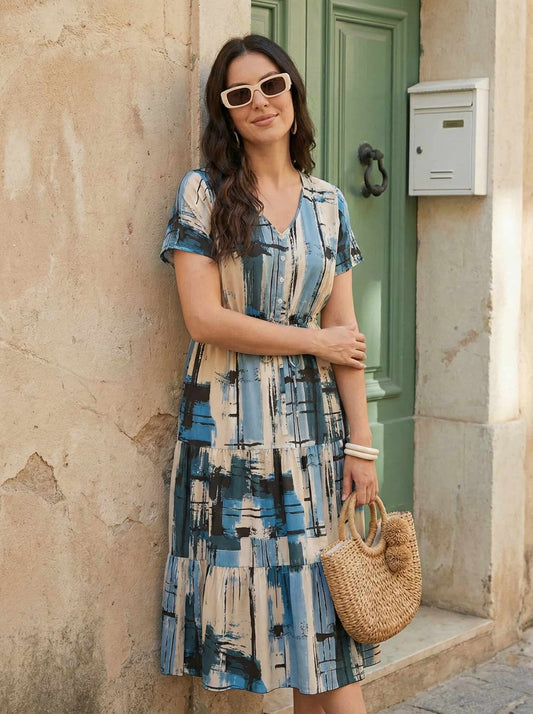 Boho Abstract Print Tiered V-Neck Drawstring Waist Midi Dress