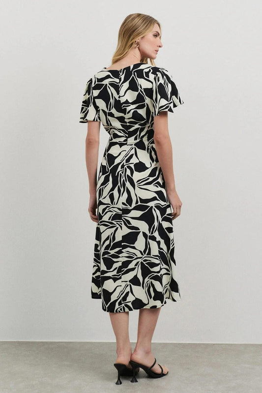 Uvercee Leaf Print Midi Dress - Flare Sleeves, V-Neckline - Black