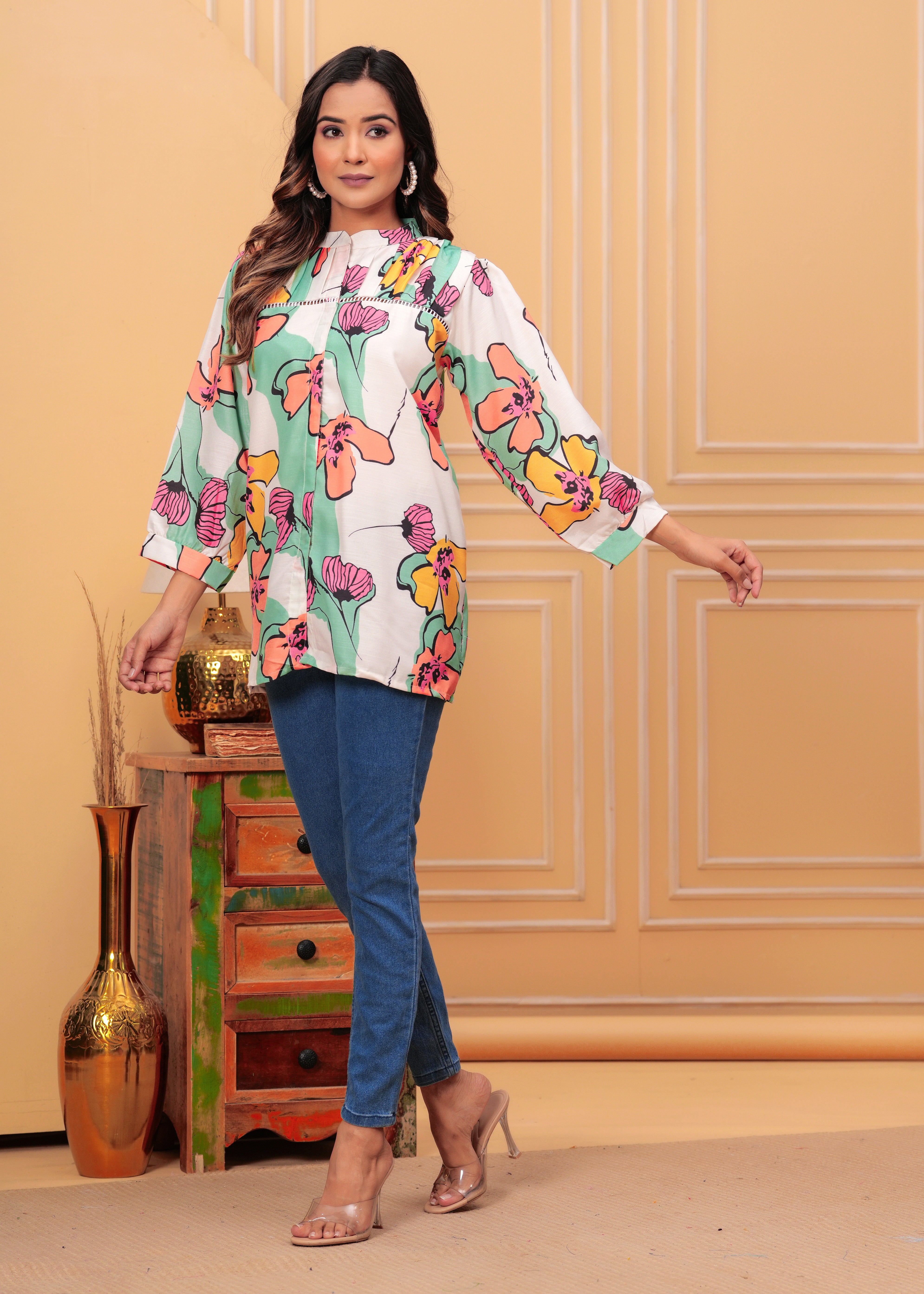 Experience seamless sophistication in our Floral Printed Beige Top, showcasing a delightful 3/4 sleeve and an elegant pleated neckline design. This adaptable top is made from airy, breathable material that keeps you feeling comfortable while still looking stylish. The soft floral pattern brings a feminine touch, suitable for casual or formal events.