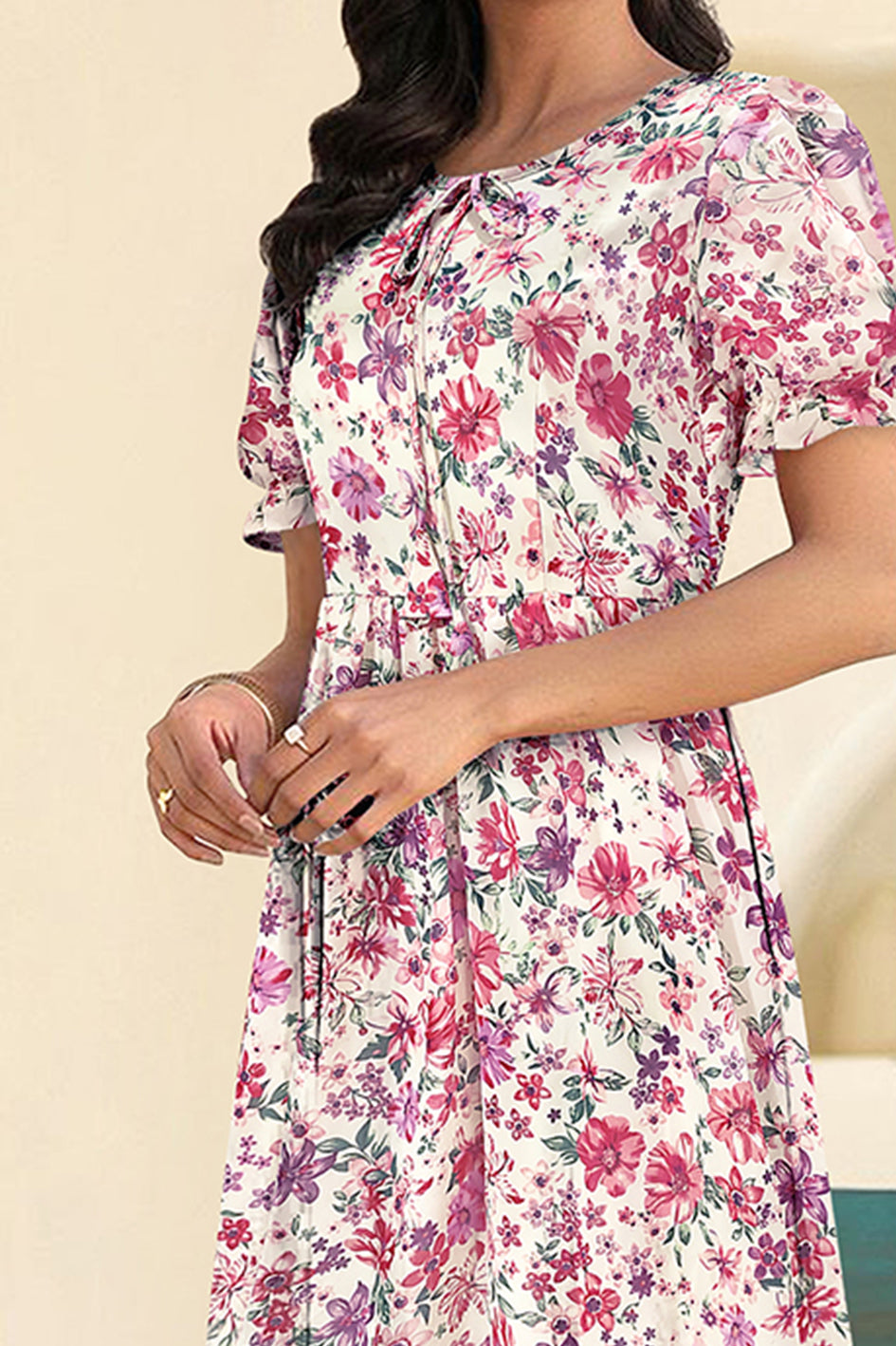 Turn heads with this Chic Floral Print Midi Dress, designed for elegant versatility across seasons. This Trending A-Line Dress features a delightful Floral Pattern and fashionable Puff Sleeves, making it an instant classic for dressy casual outings and daytime events. The Flattering Silhouette ensures a comfortable, sophisticated look whether you're at a Spring gathering or enjoying a Mild Autumn weekend. Elevate your wardrobe with this must-have piece!