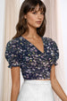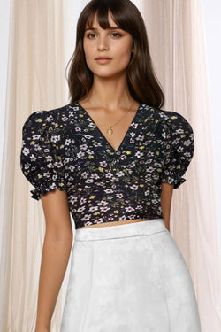 Elysian Bloom Puff Sleeve Crop Top – Chic Floral Elegance in Yellow, Black & Blue