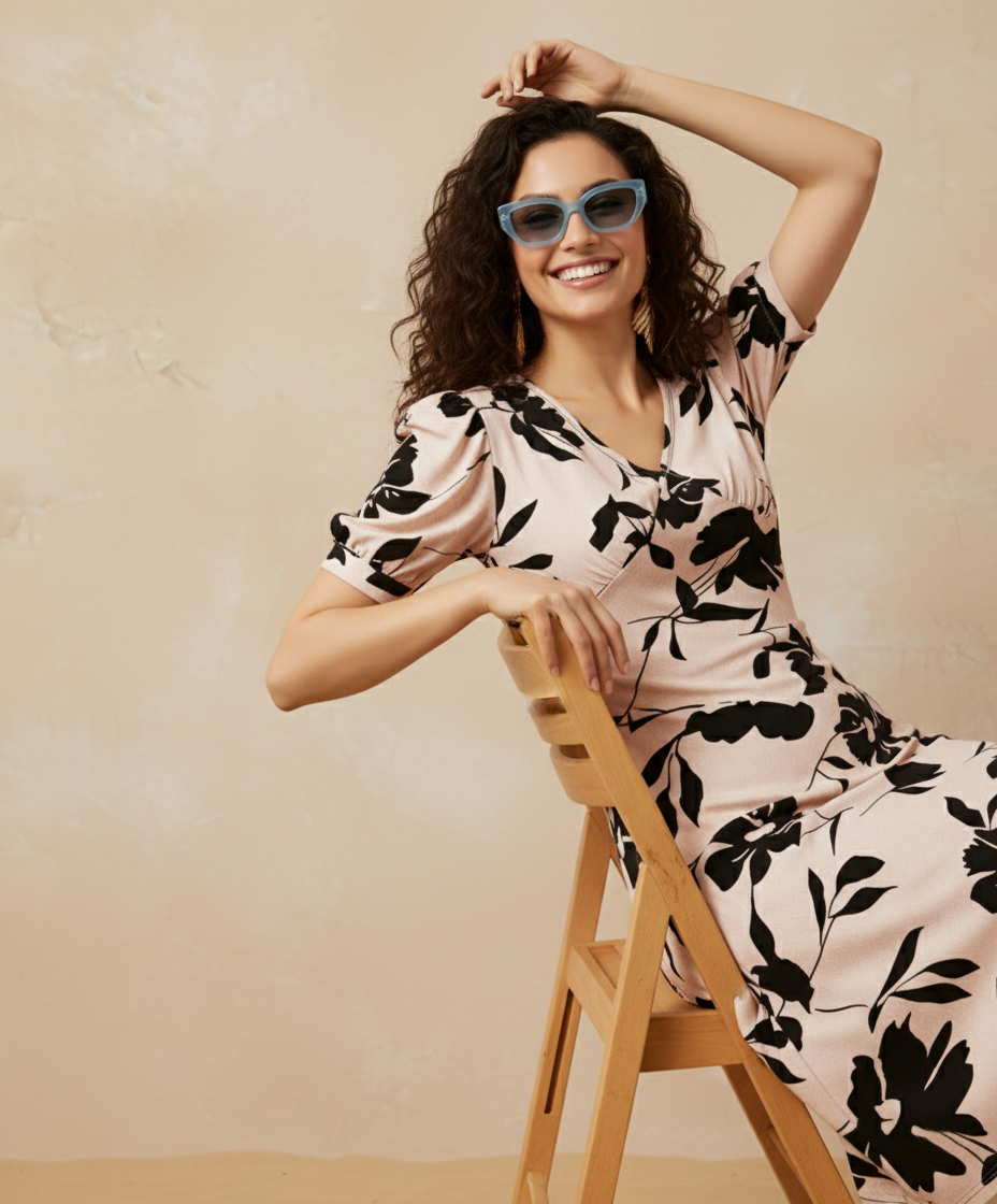 Add timeless elegance to your collection with this gorgeous Cream and Black Floral Print Wrap Dress. This piece is a must-have for fashionable women's Western wear, featuring a universally flattering V-neckline and a comfortable Fit-and-Flare Silhouette. The soft, stretchable fabric ensures comfort for all-day wear, making it an essential casual outfit. The classic monochrome floral pattern transitions effortlessly, making it perfect for your workwear, a stylish brunch, or a casual date night. Elevate your style with this elegant, trending dress!