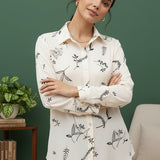 Embrace understated elegance with this Cream Minimalist Print Button-Down Shirt. This shirt is designed with a sharp point collar and a clean button-down front, offering a polished and professional silhouette. The fabric is lightweight and breathable, ensuring you stay comfortable throughout your workday. Whether tucked into black trousers for a meeting or worn loose over denim for a smart-casual vibe, this nature-inspired shirt is a versatile staple for every season.