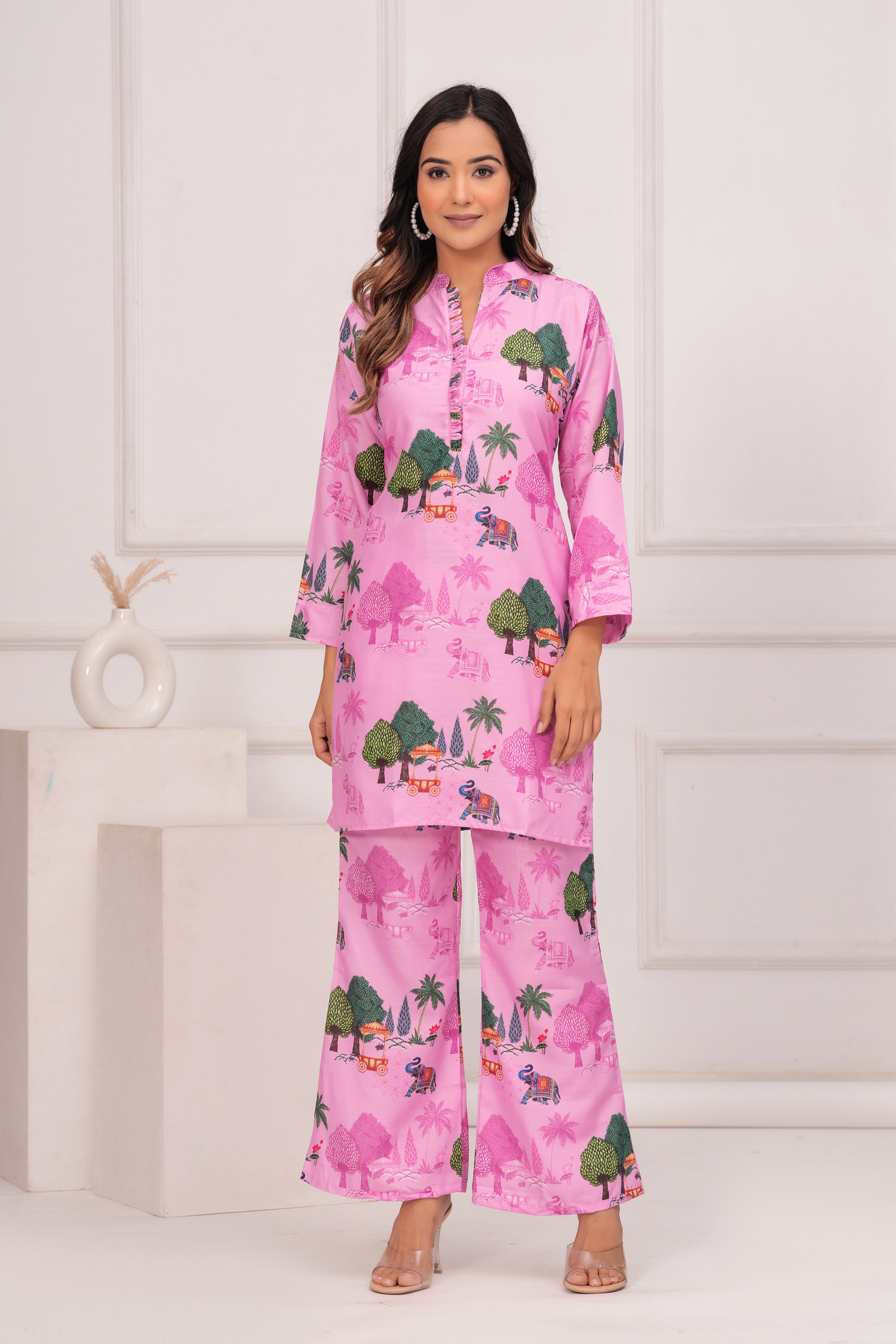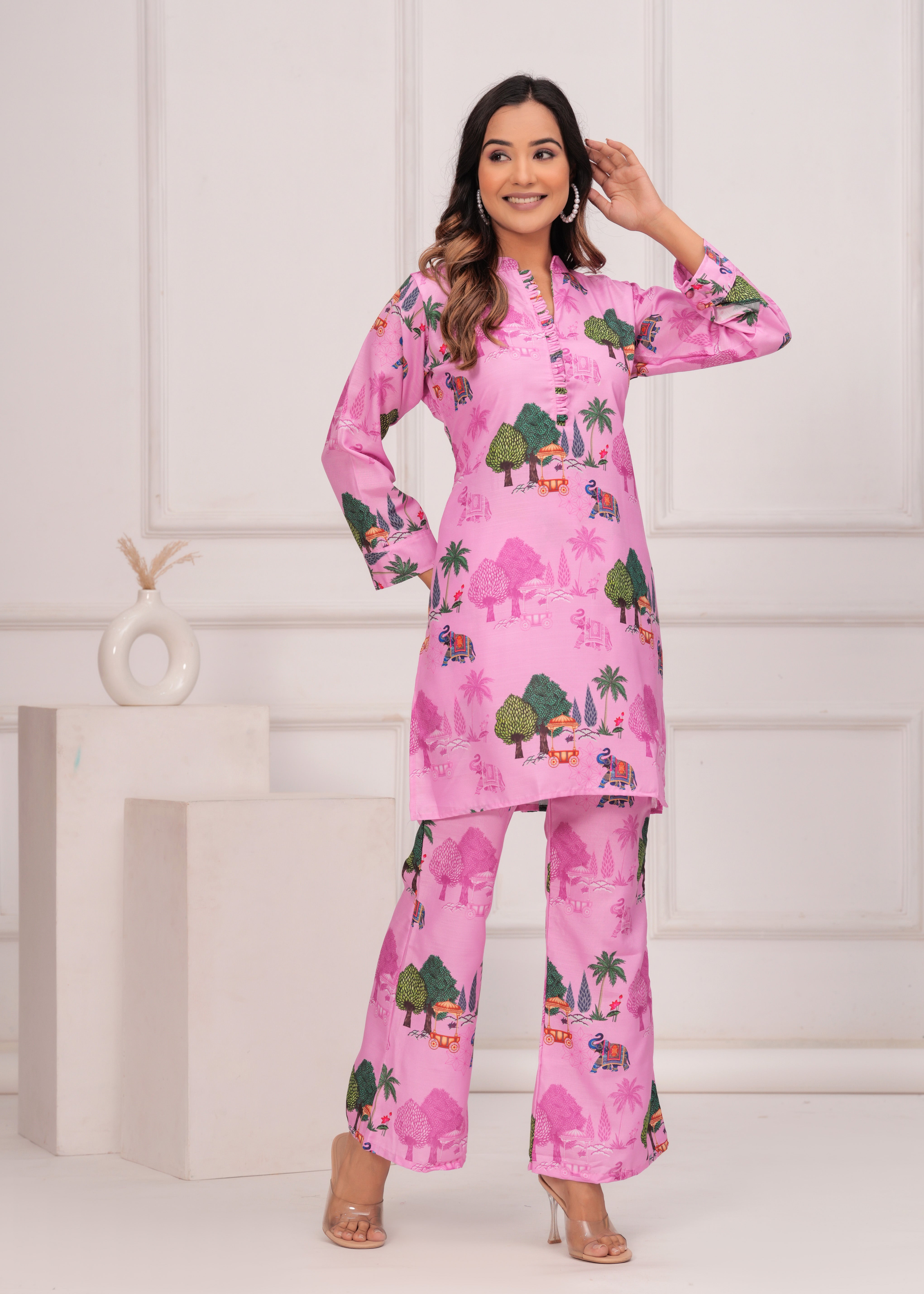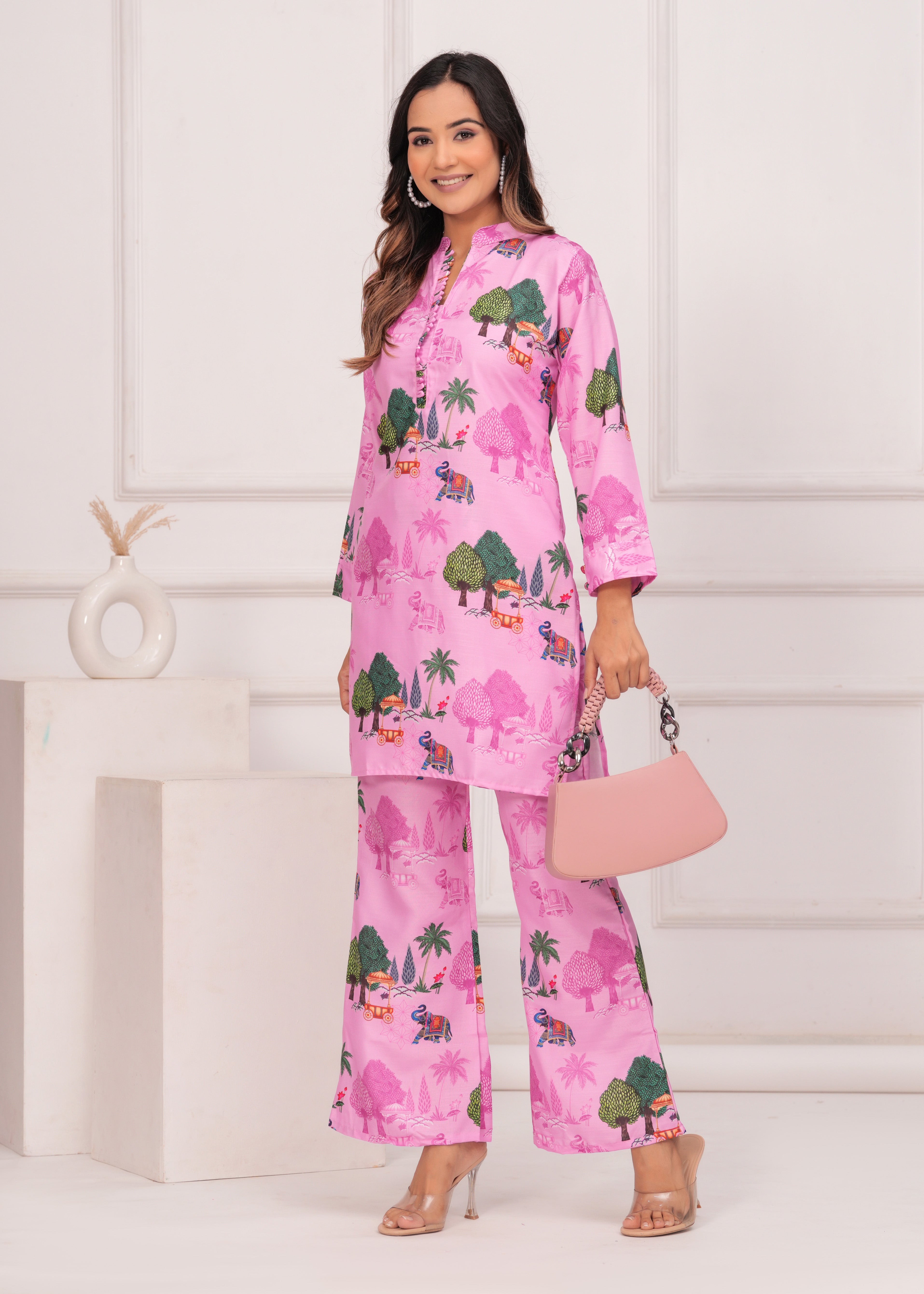 Enter a world full of lively appeal with this matching set. Whimsical illustrations decorate the soft pink hue, achieving a playful and elegant appearance. Created for comfort and style, this ensemble includes a loose-fitting top with a laid-back collar and wide-legged pants, ideal for a relaxed outing or a fun gathering. Crafted using high-quality material, it is light and simple to put on, guaranteeing your comfort throughout the day.