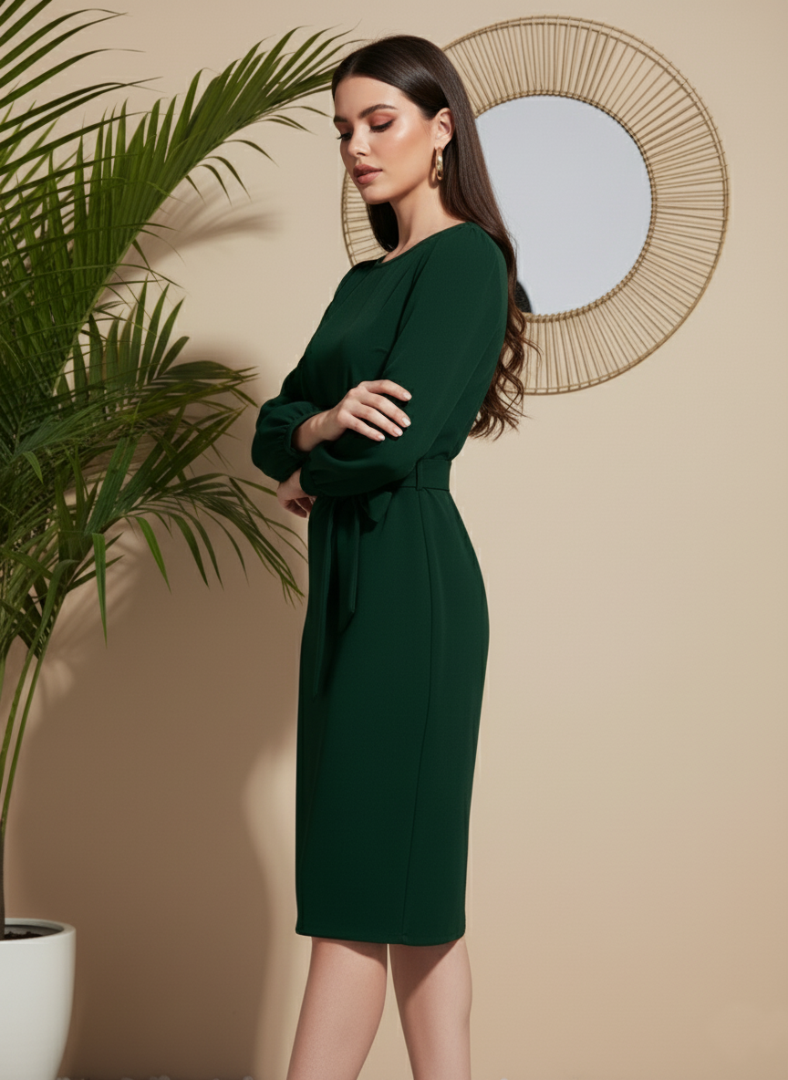 Command attention in this exquisite Emerald Green Sheath Dress. This essential piece of Women's Western Wear exudes luxury and professionalism, making it your ultimate choice for high-stakes settings. It features sophisticated long sleeves, a classic round neck, and a complimentary tie-waist detail, creating a refined, flattering slim-fit silhouette. The rich Emerald Green color is both timeless and highly eye-catching for social media feeds. Perfect for executive meetings, formal dinners, or any setting where confidence is non-negotiable. Invest in this luxurious dress and instantly elevate your workwear collection!