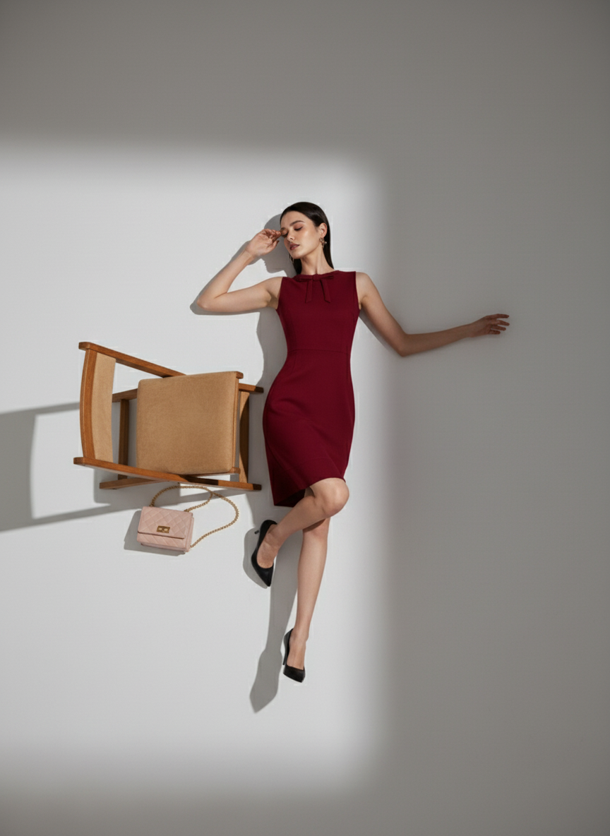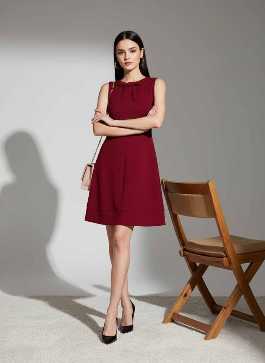 Make a sophisticated statement in this elegant Maroon Sleeveless Mini Dress. This essential piece of Women's Western Wear is designed to capture attention, featuring a charming Bow Neckline and a perfectly tailored Fit & Flare Silhouette that is guaranteed to flatter every body type. The rich Maroon (Wine) color exudes luxury, making it ideal for the festive season and formal events. Crafted from a premium, comfortable fabric, this dress ensures you look and feel confident all evening. Whether it's a cocktail party, date night, or holiday gathering, this is the versatile, trending dress you need!