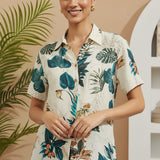 Channel effortless vacation vibes with this Tropical Print Button-Down Shirt. This women's shirt showcases a lush print of green monstera leaves and teal foliage against a soft cream background, creating a fresh and vibrant look. Crafted from lightweight, breathable fabric, this short sleeve shirt keeps you cool and comfortable on warm days. With its classic collar and button-front design, this casual shirt pairs perfectly with denim or shorts for the ultimate summer shirt style.