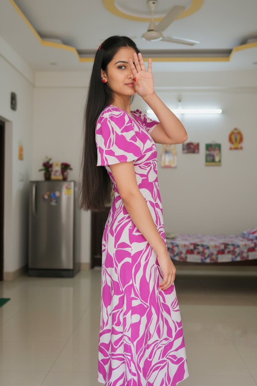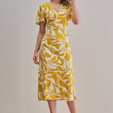 Elevate your summer wardrobe with our stunning Leaf Print Midi Dress in four vibrant colors. This floral dress features a fresh and stylish leaf pattern, perfect for casual chic or dressy occasions. Made from high-quality materials, it's comfortable, durable, and elegant with a V-neckline and short sleeves. Pair with ankle boots for a chic and sophisticated look.