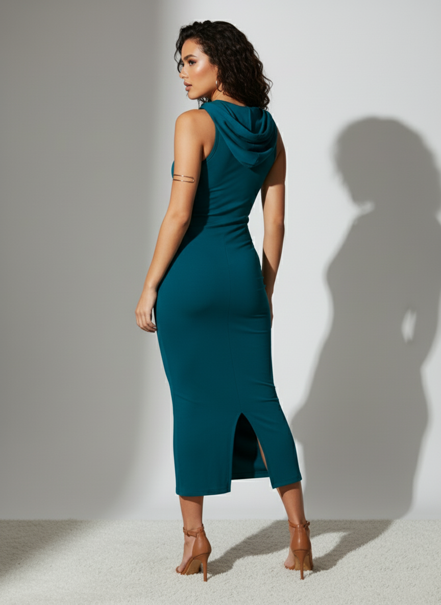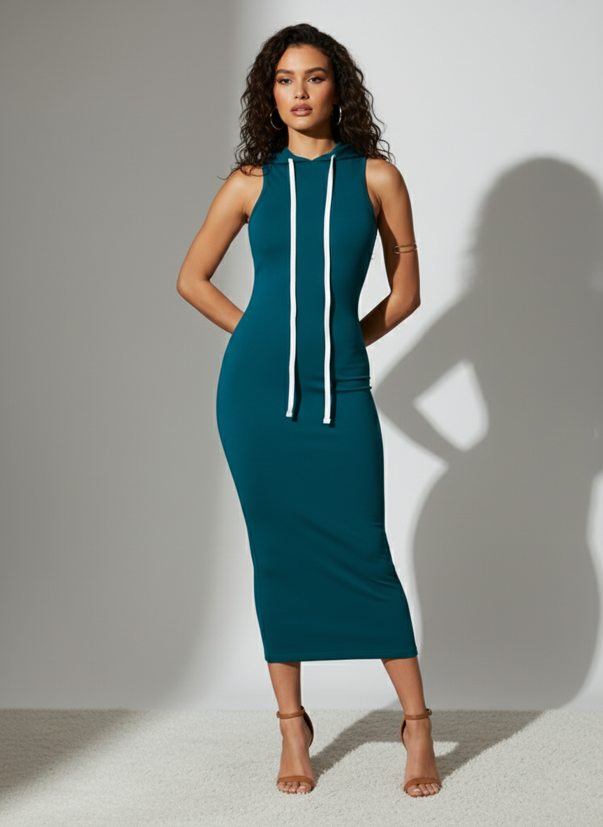 Turn heads in this sleeveless hooded bodycon midi dress, designed for the modern woman who loves confidence and style. The sleek hooded neckline with adjustable drawstrings adds a sporty-chic vibe, while the curve-enhancing bodycon silhouette delivers a bold and flattering fit. Perfect for parties, date nights, evening events, and casual outings, pair it with heels and a clutch for a glam look, or sneakers for a laid-back street style.